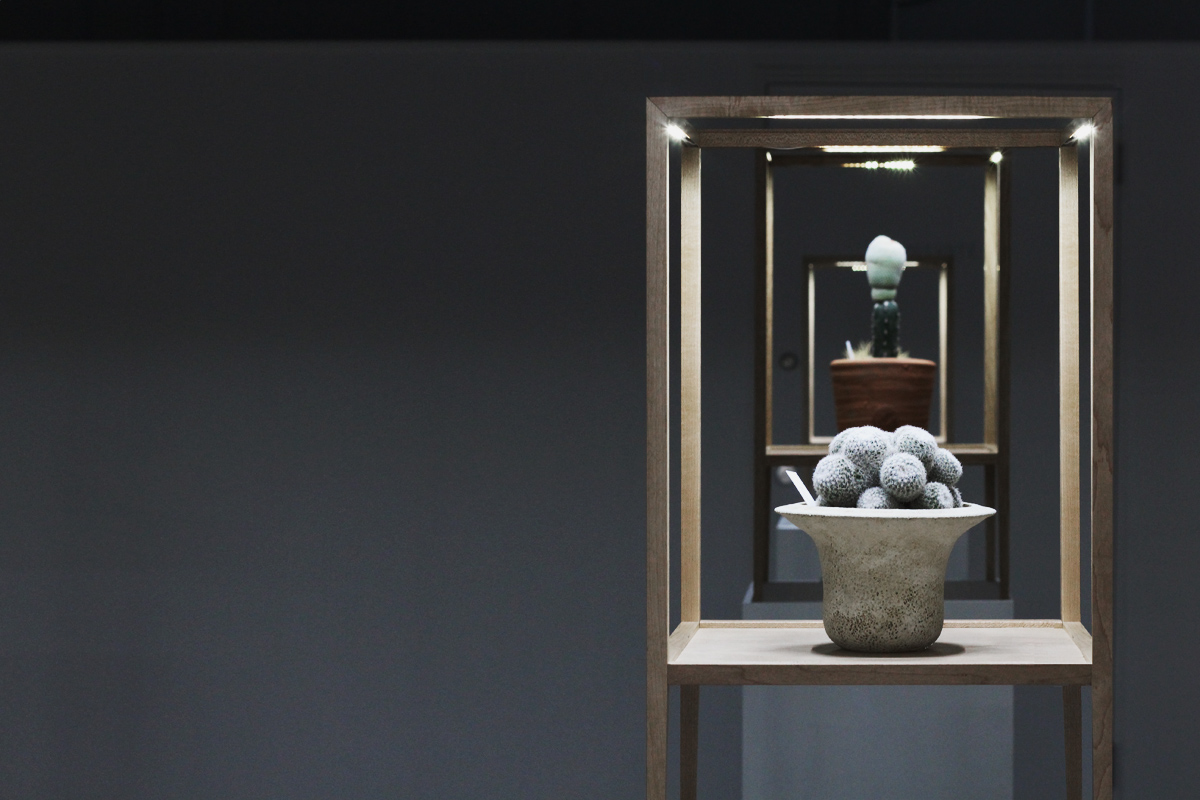 結界。細い木の枠組みの中にLEDが組み込まれていて四方からまんべんなくサボテンに光が当たります。