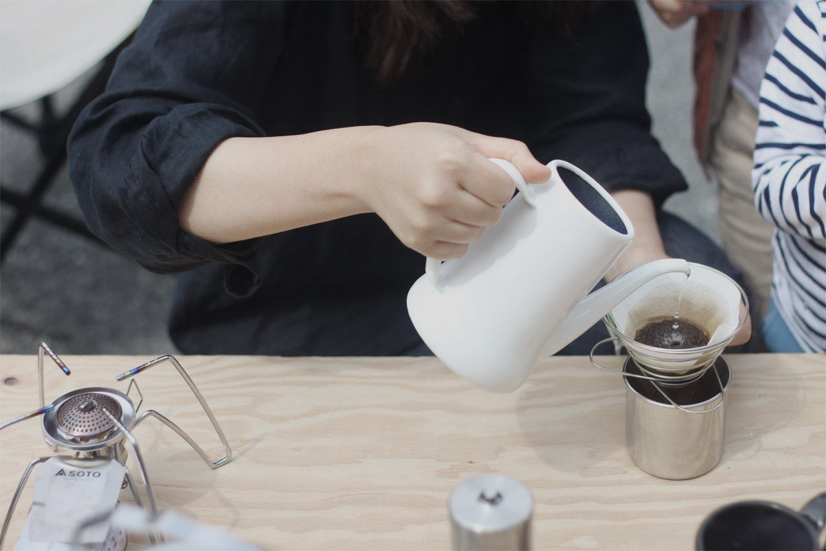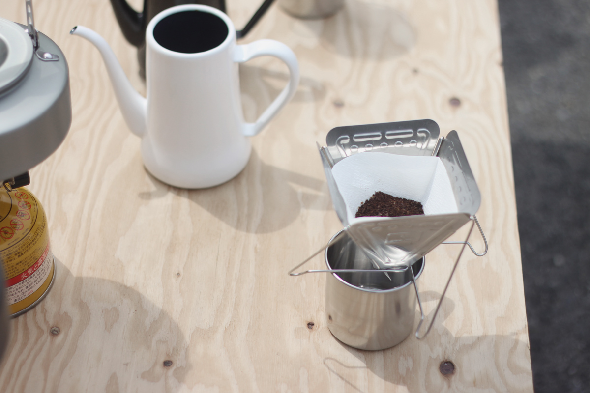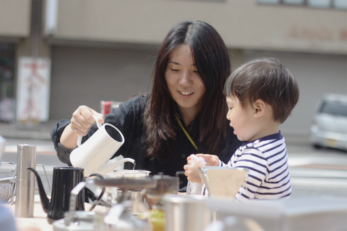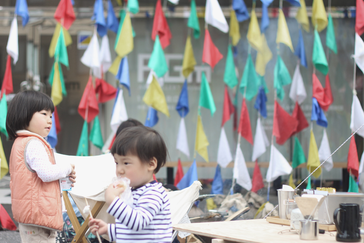 空気展でAIR SHODOU展示中のAGm。こどもの日にはノノンカさんがコーヒーガリガリワークショップをしていました。オープニングにやった時は室内だったけど、もう暖かくなったので、藤江さんオリジナルの鯉のぼりテントもでて、ポカポカ陽気の中アウトドアなかんじでコーヒー豆ガリガリ。家でもコーヒー豆ガリガリ担当の奏に今日もガリガリしてもらいました。円錐型のフィルターの場合にお湯を注ぐときは円を描かないで真ん中に注ぐそうです。ぽたぽた。