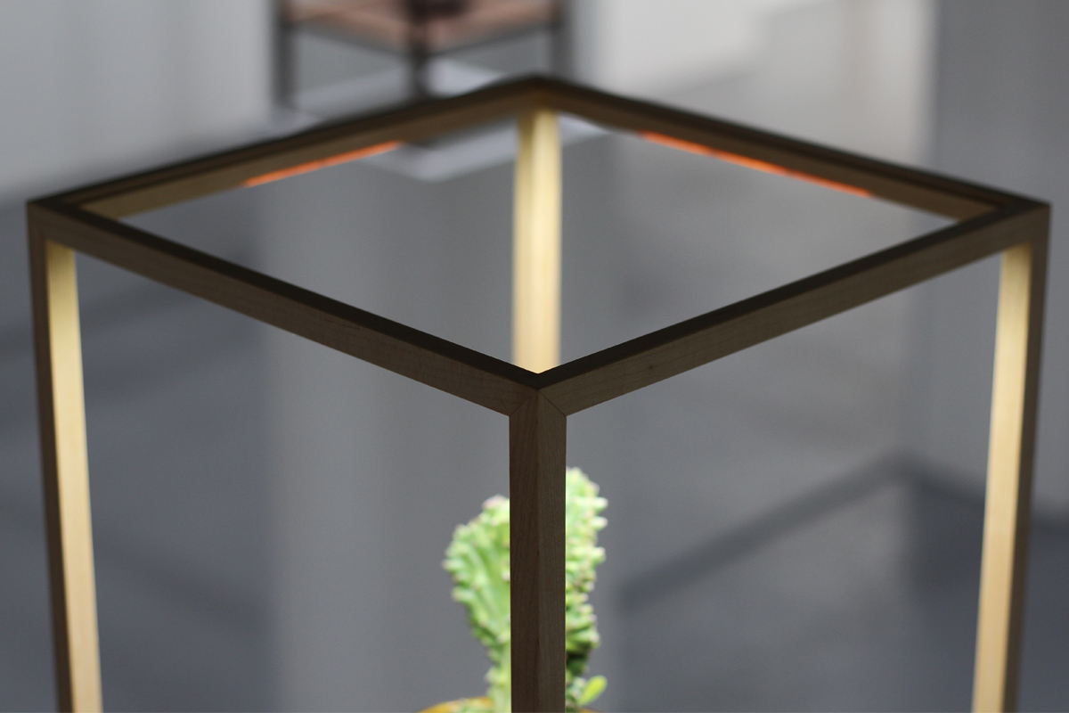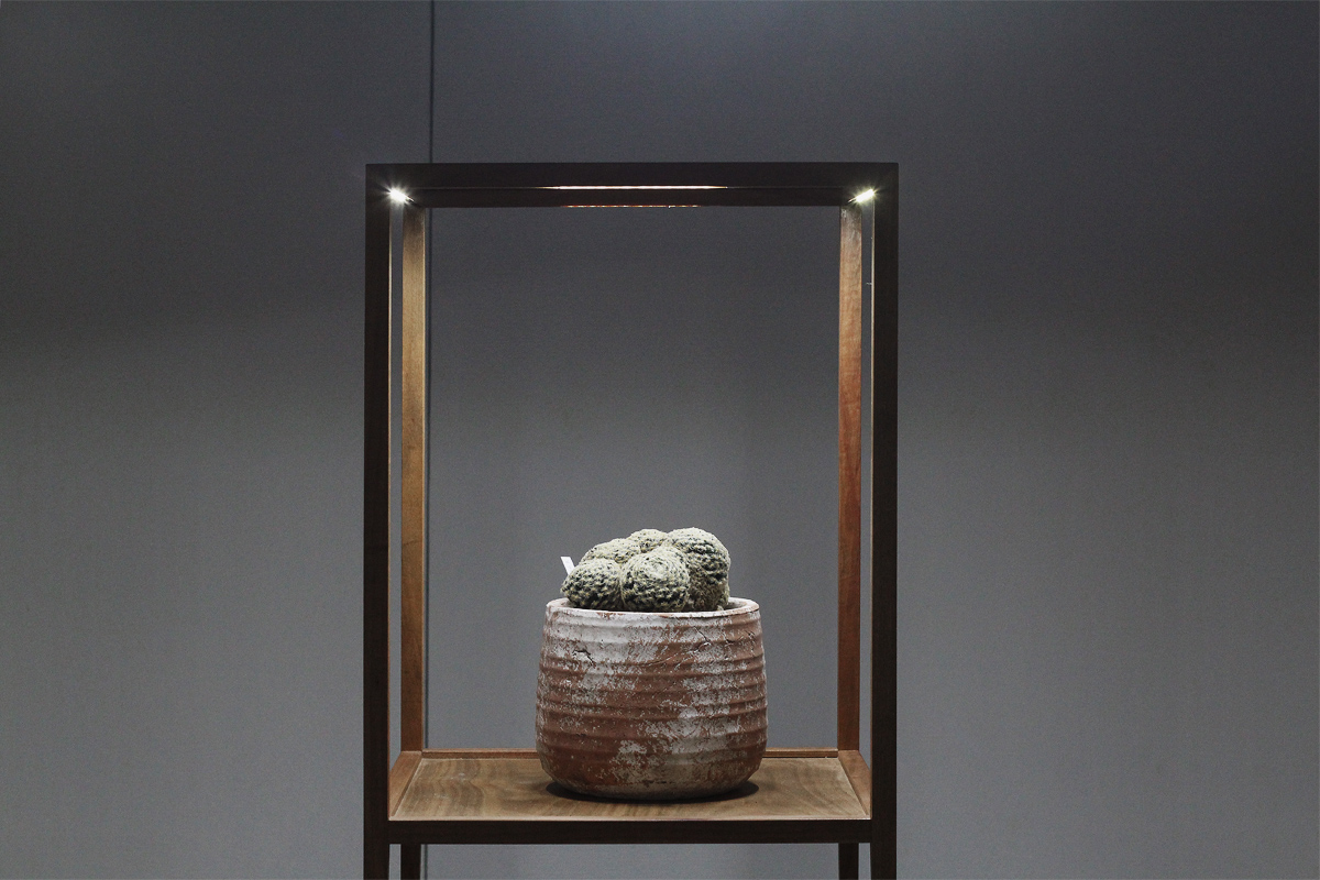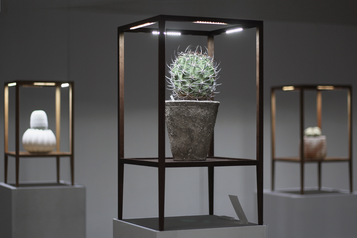 結界。細い木の枠組みの中にLEDが組み込まれていて四方からまんべんなくサボテンに光が当たります。
