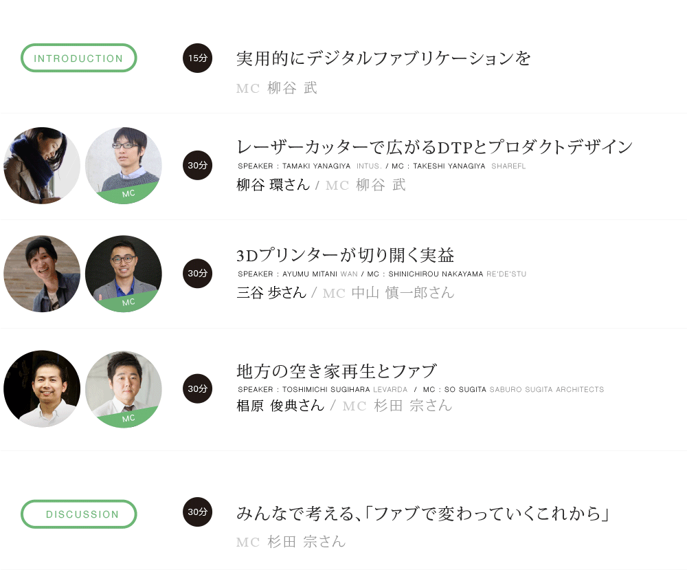 会場にお越しの方と登壇した3名とMC3名を交え、ファブについてわかったこと、それぞれの業界での可能性についてやディスカッションお行えたらと思っています。