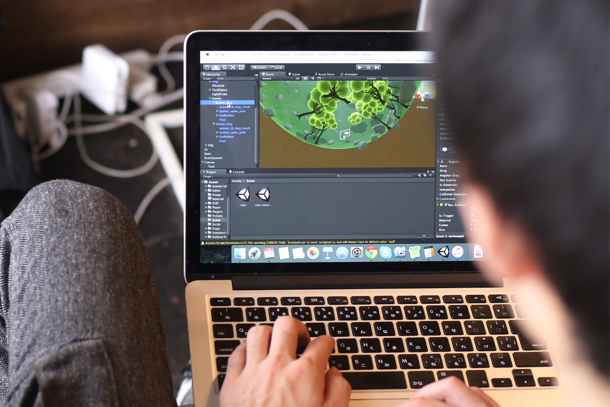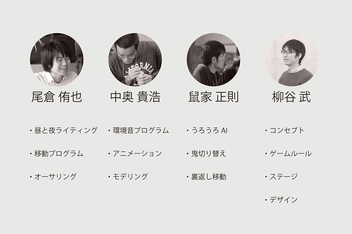 ハッカソンを主催、イベントを仕切りながら、プログラマとしてうちのチームにも参加する尾倉さん…めちゃめちゃしっかりものの大学生さんです。 普段は電柱工事のお仕事されている中奥さんは、趣味でUnityのコミュニティーによく参加されているそうで今回もこられています。 初めてUnityに触れるという鼠家さん、数学の知識を活かしてガンガン実装してもらいました。 柳谷はゲームプランニングとかプログラムの仕様ディスカッションとかデザインとかを担当しました。