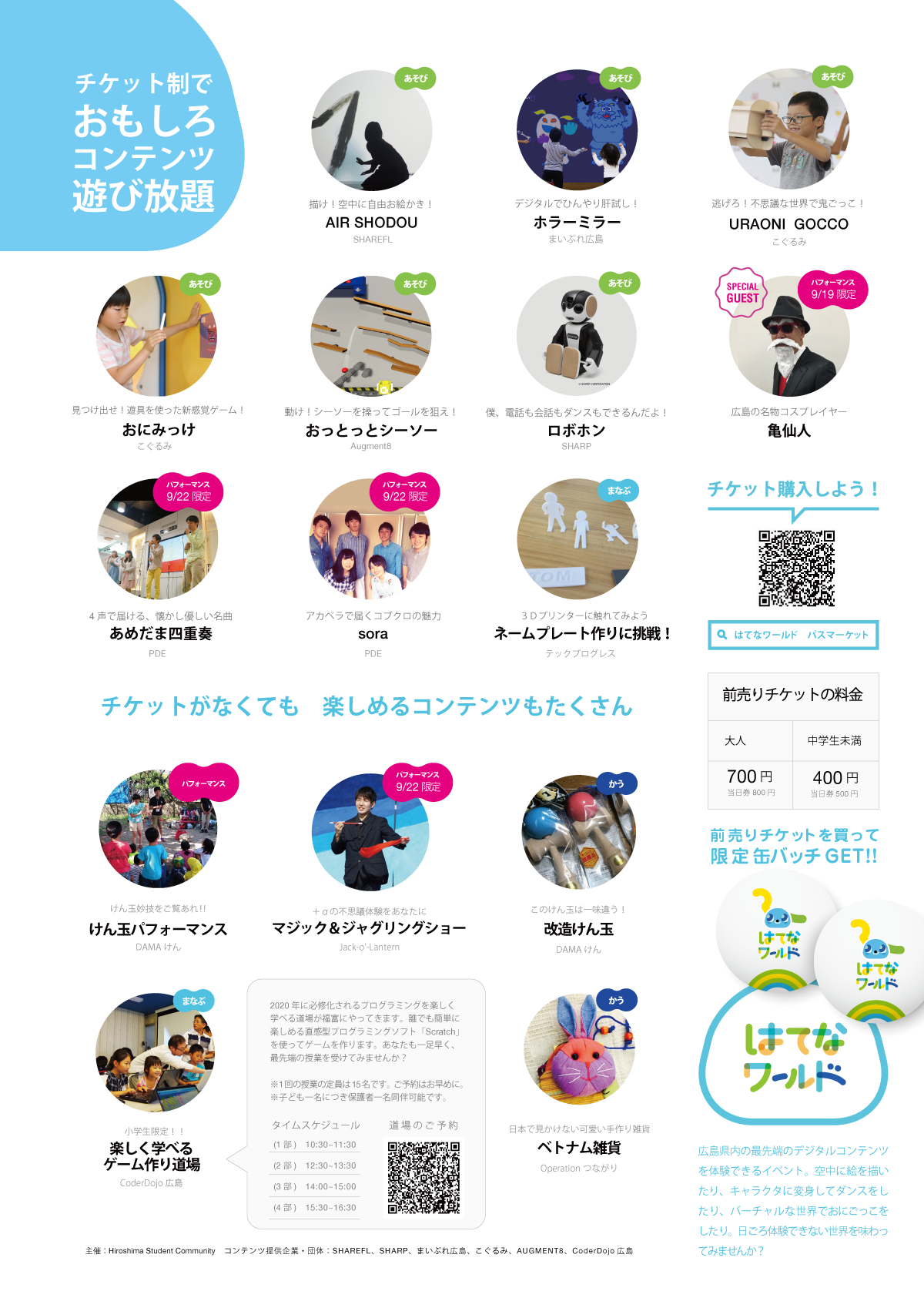 体に反応するシーソーゲームなど、子供が楽しめるコンテンツがたくさん集まります。さらにライブもあって、亀仙人やシャープのロボホンにも会えちゃいます。