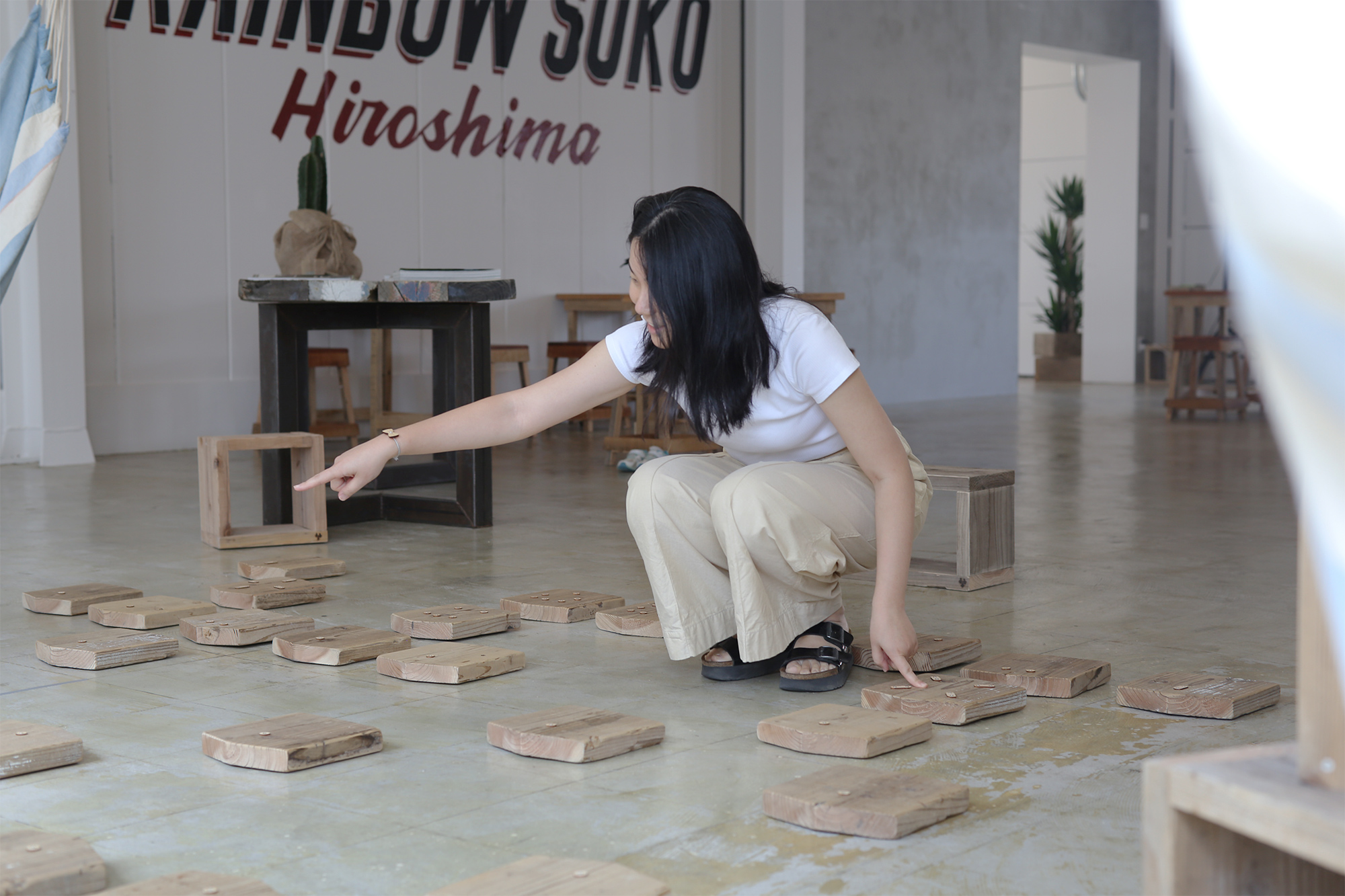 足場板の風合いとは異なる、木目の目立たない白い滑らかなシナ材とのコントラストがはっきりしているので、遠くからでもピクトサインが目立ちます。木工職人では表現しづらい細かな加工のできるレーザーだからこそ実現できたプロダクトです。