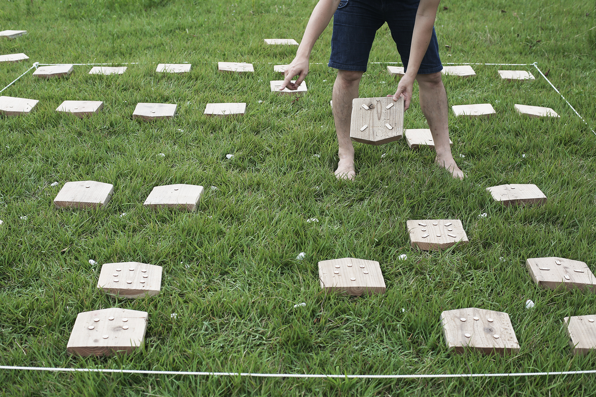 (1)ロープ止めを芝にさして、1辺約3mの四角にロープをはる (2)大体の目安が分かるように、白い石を置く (3)将棋を並べて完成 |